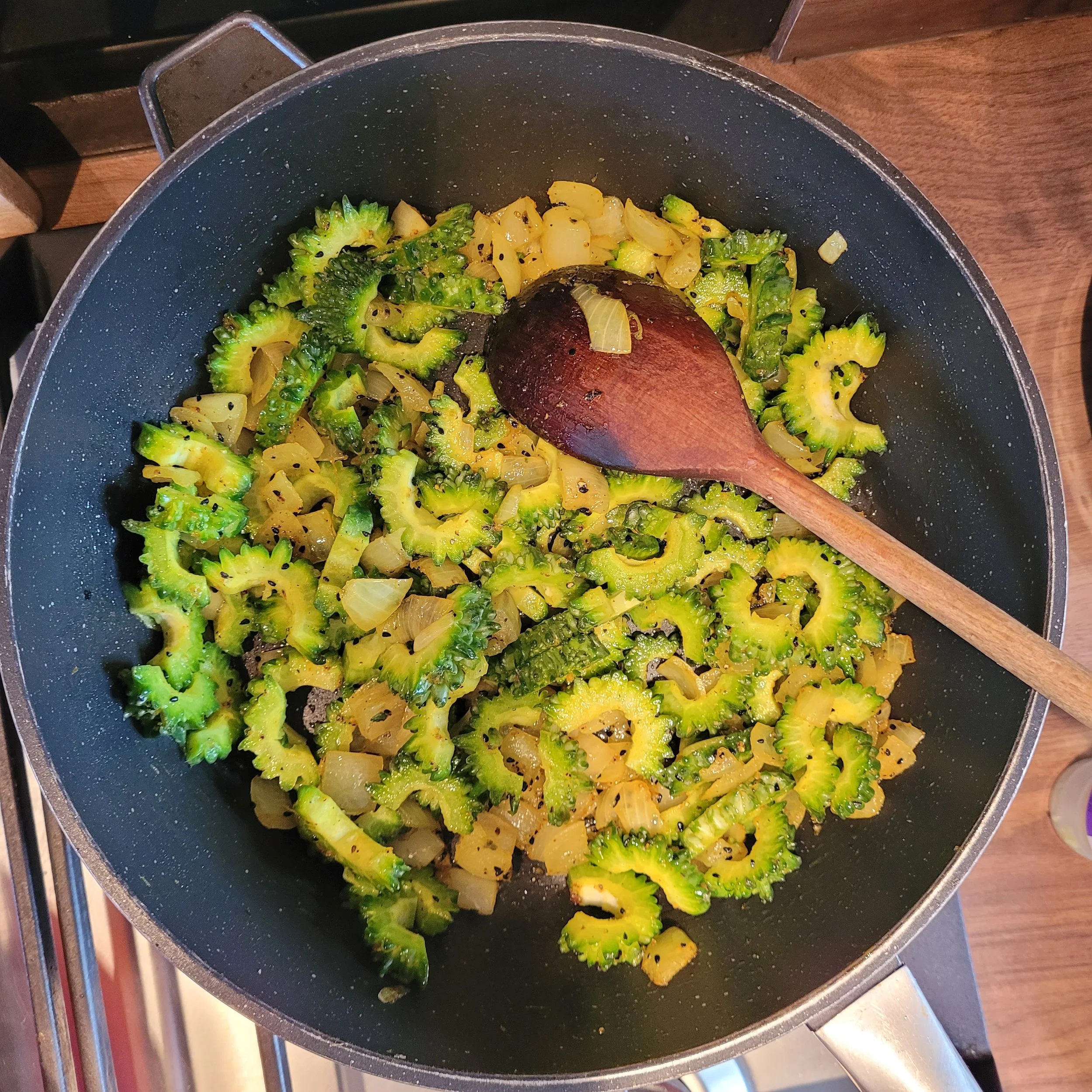 Next add the ginger and garlic and cook for a further few minutes until fragrant before adding the turmeric powder and black pepper (using black pepper with turmeric enhances the bioavailability of the turmeric). Cook for a further few minutes before adding the bitter gourd slices.